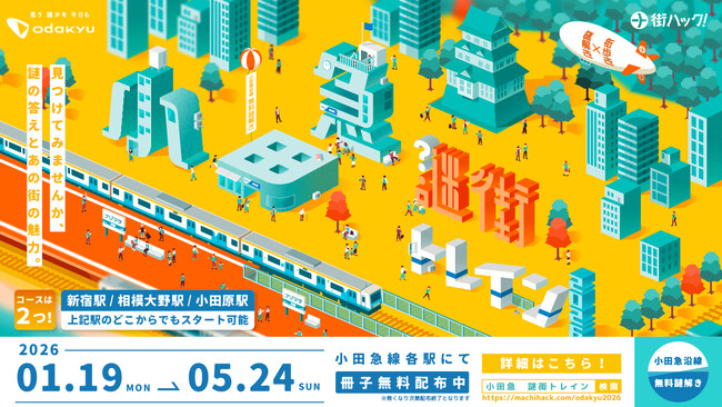 株式会社休日ハック(本社:東京都台東区、代表取締役社長:田中 和貴)は、小田急電鉄株式会社(本社:東京都新宿区 社長:鈴木 滋)が、2026年1月19日(月)から5月24日(日)まで開催する、小田急線各駅で無料配布する冊子を片手に、小田急線を乗り継ぎながら沿線各街に仕掛けられた数々の謎解きに挑戦し、ゴールを目指す体験型イベント「小田急謎街トレイン2026」の企画制作を行いました。