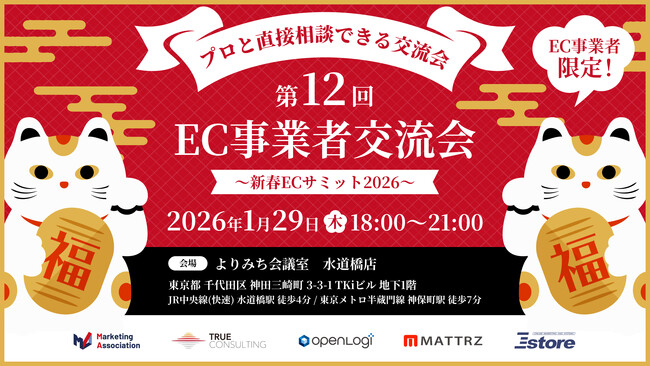 ECサイトの運営代行サービスを提供しているマーケティングアソシエーション株式会社(本社:東京都台東区 代表取締役:中園広和、以下当社)は、2026年1月29日(木)にリアルイベント「【第12回 EC事業者交流会】~新春ECサミット2026~ EC事業者限定!プロと直接相談できる交流会」を、トゥルーコンサルティング株式会社、株式会社Eストアー、Mattrz株式会社、株式会社オープンロジと共催いたします。