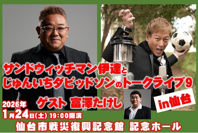 2023年1月以降、不定期に開催されてきた『サンドウィッチマン伊達とじゅんいちダビッドソンのトークライブ』シリーズ。9回目となる今回は、初めて東京都内を離れて、伊達みきお(サンドウィッチマン)の地元・仙台での開催になります!シリーズ初のゲストに富澤たけし(サンドウィッチマン)を迎えて開催する本公演を、お見逃しなく!