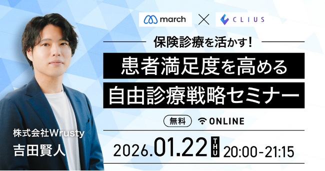 LINEを活用した集患と継続収益まで自動化することで、医療機関の “成果に責任を持つ” オンライン診療・集患オペレーションSaaS「march」を展開する株式会社Wrusty(本社:東京都渋谷区、代表取締役:上田遼)と、予約・診察・院内フローまで一元化できるクラウド型電子カルテCLIUS(クリアス)展開する株式会社Donuts(本社:東京都渋谷区、代表取締役:西村 啓成)が、医療法人社団季邦会 街のクリニック立川・村山 理事長/院長、鎌形博展先生を交えて、全国の開業医・開業予定医の皆様を対象に、無料オンラインセミナー「保険診療を活かす!患者満足度を高める自由診療戦略セミナー」を2026年1月22日に開催いたします。本セミナーでは、保険診療を主とする医療機関にとって、自由診療の導入によって新たな収益源を確保し、患者満足度を高める重要な戦略と、「どのように自由診療を始めれば良いのか?」「どの診療科にどんな戦略が有効か?」といった疑問を解消し、保険診療の強みを最大限に活かし、オンライン診療のメリットも取り入れた、実践的な自由診療戦略を徹底解説します。