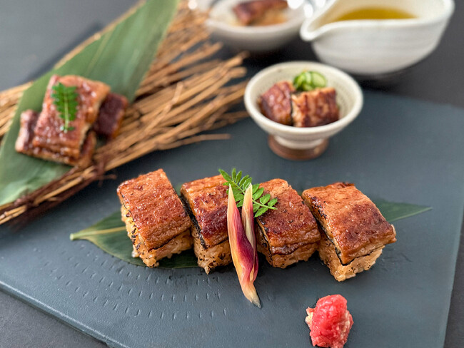 また、優秀賞にはオリエンタルホテル福岡 博多ステーション(福岡)の藤田耕司シェフによる「精進鰻づくし」が選出されました。ヴィーガンと精進料理を結び付けた発想から着想し、九州のもめん豆腐、山芋、牛蒡、海苔を使用。蒲焼、寿司、酢の物、お茶漬けの四種の食べ方で楽しめ、鰻に限りなく近い食感と味わいを表現した作品です。