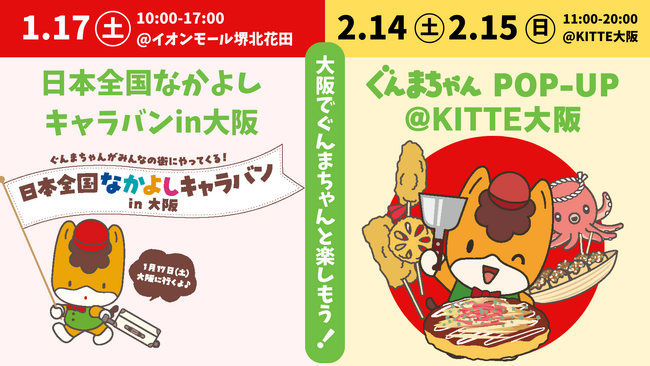 群馬県は、群馬県の宣伝部長ぐんまちゃんが登場するイベント「日本全国なかよしキャラバンin大阪」「ぐんまちゃんPOP-UP@KITTE大阪」をそれぞれ開催します。