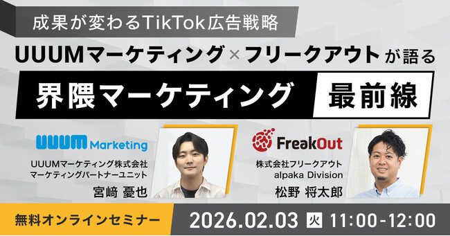 UUUMマーケティング株式会社(本社:東京都港区、代表取締役 社長執行役員:鈴木 司、以下「UUUMマーケティング」)は、株式会社フリークアウト(本社:東京都港区、代表取締役:時吉 啓司、以下「フリークアウト」)と共催で、「~成果が変わるTikTok広告戦略~UUUMマーケティング × フリークアウトが語る「界隈マーケティング」最前線」と題したウェビナーを、2026年2月3日(火)11:00~12:00に開催します。