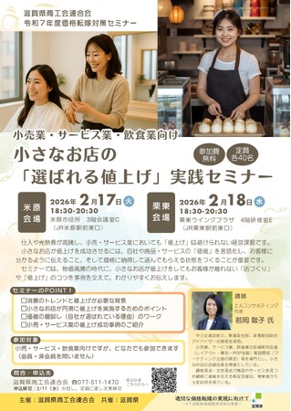 滋賀県商工会連合会(住所:大津市打出浜2番1号 コラボしが21 5階、会長:上西 保)は、滋賀県と共催し、滋賀県内の中小・小規模事業者を対象に、県内2カ所で「価格転嫁対策セミナー」(小売業・サービス業・飲食業向け)を開催します。
