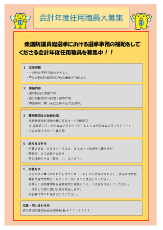徳島市選挙管理員会において、衆議院議員総選挙における選挙事務の補助業務を行う会計年度任用職員を募集しています。