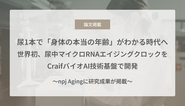 バイオAIスタートアップのCraif株式会社(本社:東京都新宿区、代表取締役CEO:小野瀬 隆一、以下Craif)は、尿中に含まれるマイクロRNA(miRNA)を独自のバイオAI技術基盤で解析し、生物学的年齢(=細胞レベルの老化度)を高精度に推定するエイジングクロックを開発しました。本研究成果は、2025年12月15日に老化や健康寿命延伸に関する国際学術誌 npj Aging に掲載されました。