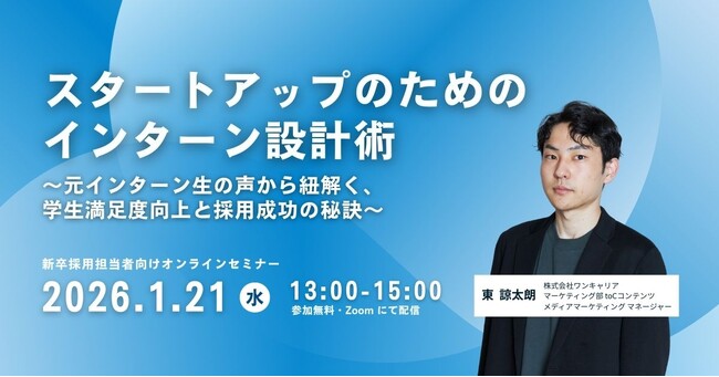 新卒採用サービス「ワンキャリア」を運営する株式会社ワンキャリア(本社:東京都渋谷区、代表取締役社長 執行役員CEO:宮下 尚之、以下「ワンキャリア」)は、スタートアップ向けオンラインセミナーとして、「スタートアップのためのインターン設計術」を2026年1月21日(水)に開催します。