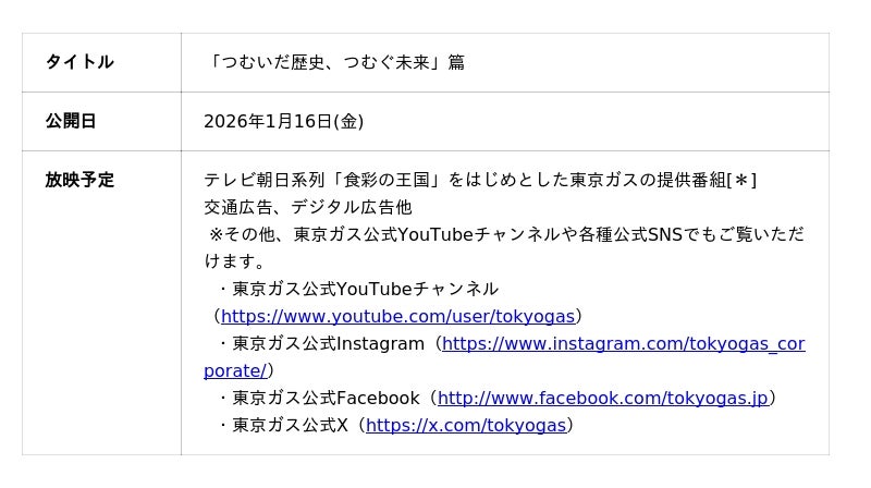 東京ガス株式会社(以下「東京ガス」)は、本日、新作企業CM「つむいだ歴史、つむぐ未来」篇(以下「本CM」)を公開しました。