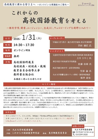 大正大学(学長:神達知純、所在地:東京都豊島区)附属図書館は、2026年1月31日(土)に高校教育に携わる方を対象とした、オンライン講座「これからの高校国語教育を考える」を開催します。