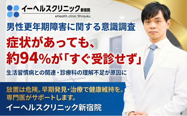 イーヘルスクリニック新宿院(東京都新宿区)は、全国の男性を対象に「男性更年期障害(LOH症候群)」に関するアンケート調査を実施しました。その結果、男性更年期障害という病気自体は一定程度認知されているものの、生活習慣病との関連や受診すべき診療科については十分に理解されておらず、症状を感じていても約94%がすぐには医療機関を受診しない実態が明らかになりました。