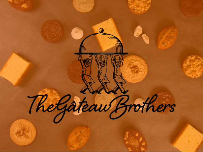 「ザ・ガトーブラザーズ」のロゴには、三人のシェフがコックコート姿で並び、ひとつの蓋(クローシュ)をともに担ぐ姿が描かれています。