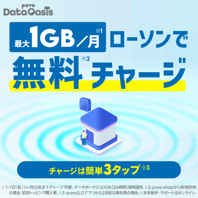 KDDI、沖縄セルラーは2026年1月16日から、特定の場所でもれなくデータが無料でもらえる「povo Data Oasis」の利用手順をアプリ起動、特設バナー、チャージ追加の3タップに簡略化します。(注)