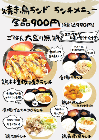 焼き鳥ランドでお得なランチがスタート。全品900円でお得に本格的な鶏料理をお楽しみいただけます。ご飯大盛無料。ミニサラダ、お味噌汁付き!!