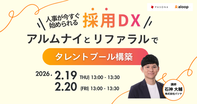 株式会社パソナは、人材採用のご担当者様へ向けたウェビナー、「人事が今すぐ始められる採用DX-アルムナイとリファラルでタレントプール構築」を2月19日(木)、20日(金)にオンラインで開催いたします。
