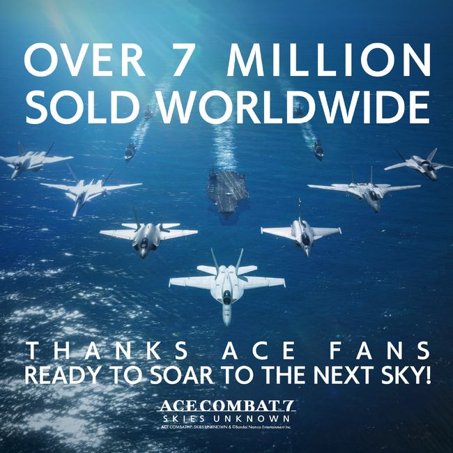 株式会社バンダイナムコエンターテインメントは、『ACE COMBAT(TM)7: SKIES UNKNOWN』が世界累計販売本数が700万本に到達し、これによりエースコンバットシリーズの世界累計販売本数が 2,100万本を突破したことをお知らせいたします。(※)