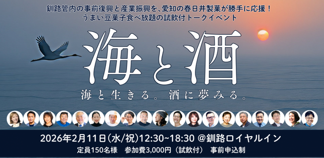 春日井製菓株式会社(本社:愛知県名古屋市、代表取締役:春日井大介)はトークイベント「海と酒」の第2回を、2月11日(水・祝)に北海道・釧路市で開催します。当日は漁業従事者からまちづくり会社、酒造メーカー、飲食、流通、航空、行政、大学など、釧路市内外で活躍する各界のキーパーソンが勢揃い。業種・立場を超え、成功談だけではない本音が飛び交うトークセッションは、地域創生や事前復興、企業経営に役立つヒントが満載です。