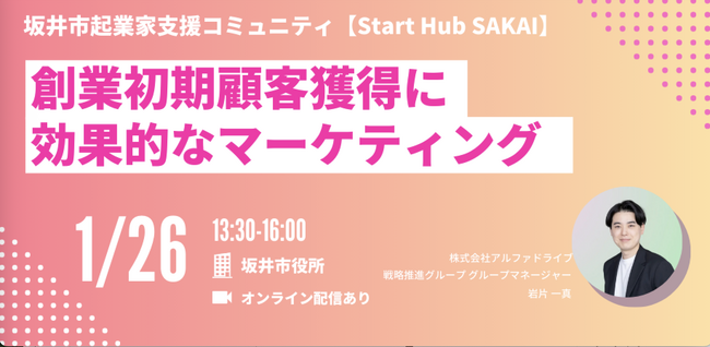 株式会社アルファドライブ(本社:東京都千代田区、代表取締役社長 兼 CEO:麻生要一、以下AlphaDrive)は、福井県坂井市と共に推進する起業家支援コミュニティ「Start Hub SAKAI」の取り組みの一環として、2026年1月26日(月)に「創業初期顧客獲得に効果的なマーケティング」をテーマとしたハイブリッド型セミナーを開催いたします。