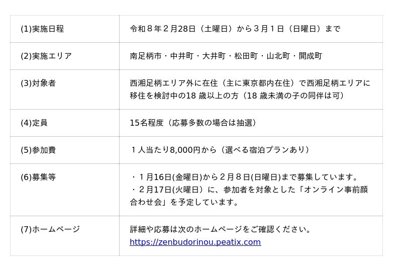 さらに、本ツアーの受託事業者(合同会社hibhi.(ヒビ))は、「西湘足柄移住コンシェルジュ」(注記2)を運営しているので、ツアー前から後まで、どんな小さな不安・疑問にもお答えします。