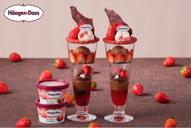 2026年のバレンタインシーズンはハーゲンダッツ アイスクリーム「ストロベリー」と「ミルクチョコレート」の2種のアイスクリームを主役に、旬のいちごと多彩な素材を贅沢に重ねた至高のパフェを期間限定で販売いたします。