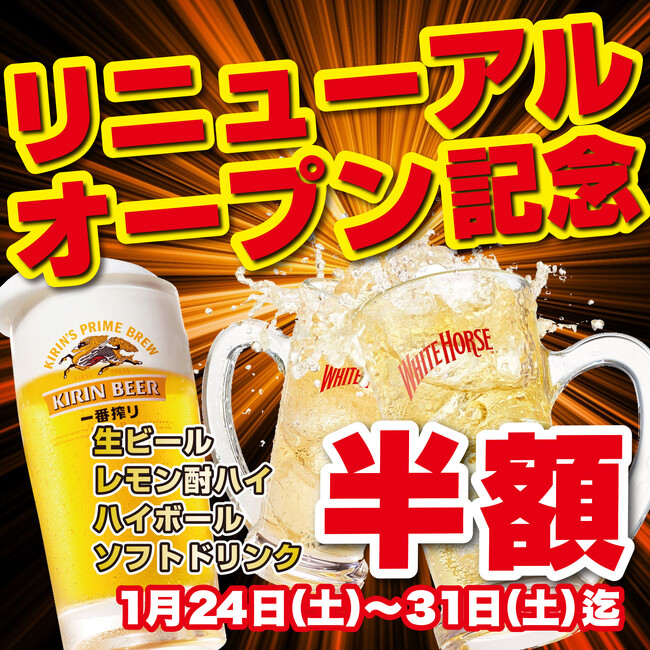 リニューアルオープンを祝して、人気ドリンクメニューを通常価格の半額にてご提供いたします。仕事帰りの一杯からご家族での団らんまで、お得にお楽しみいただけるチャンスです。