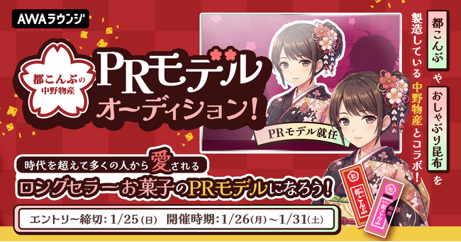 AWA株式会社(本社:東京都港区、代表取締役CEO:冨樫晃己)が運営する、サブスクリプション型(定額制)音楽ストリーミングサービス「AWA(アワ)」は、時代を超えて多くの人から愛されるロングセラーお菓子のPRモデルになれる、『都こんぶ』の中野物産 PRモデルオーディションを開催いたします。