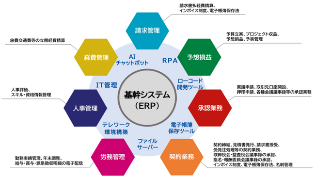 ITリエンジニアリングサービスは、企業の業務効率化とDX化を7つの業務、請求管理、経費管理、人事管理、労務管理、契約業務、承認業務、および予想損益を軸に全面的に支援する当社独自のサービスです。