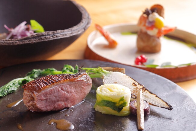 お肉料理は近江鴨と和牛フィレ肉をお好みで。滋賀県産近江鴨はクセが少なく、しっとりと柔らかい肉質が特徴です。梅肉とレモンで和の風味が引き立ち、適度な脂と鴨特有の豊かな香りをお楽しみいただけます。