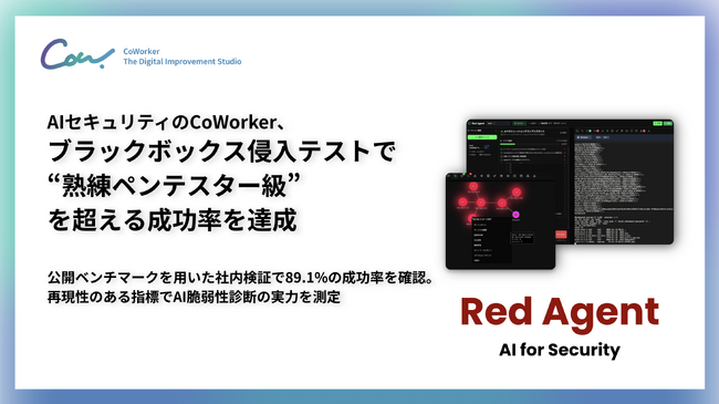 AIセキュリティソリューションを開発・提供するCoWorker株式会社(本社:東京都新宿区、代表取締役:山里一輝、以下「当社」もしくは「CoWorker」)は、自社開発の自律型AI脆弱性診断・ペネトレーションテスト「RedAgent」が、実世界に近い社内検証においてAIによる自動脆弱性診断が“熟練ペンテスター”に匹敵する段階に到達したことをお知らせいたします。今回実施した社内検証は、公開されている実世界に近いWeb脆弱性ベンチマーク(XBOW Validation Benchmarks)を参照し、ブラックボックス条件で89.1 %の成功率を確認しました。
