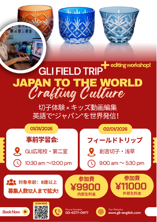 今回のフィールドトリップでは、東京・浅草にて日本の伝統工芸「切子」を体験します。GLIがこの体験に切子を選んだ理由は、世界から高く評価される「日本の美」が、伝統技術とその背景にある物語によって支えられているからです。単なる見学や制作にとどまらず、体験の様子を自ら撮影し、簡単な動画編集スキルを学び、完成した作品と学びを英語で世界に向けて発信します。実体験とアウトプットを通じて、日本文化の価値を自分の言葉で語れる力を育みます。