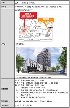 三菱UFJ信託銀行株式会社(取締役社長 窪田 博、以下 三菱UFJ信託銀行)浦和支店は、再開発事業による建て替えのため仮店舗にて営業しておりますが、再開発事業の終了に伴い2026年7月27日(月)に新店舗へ移転予定です。