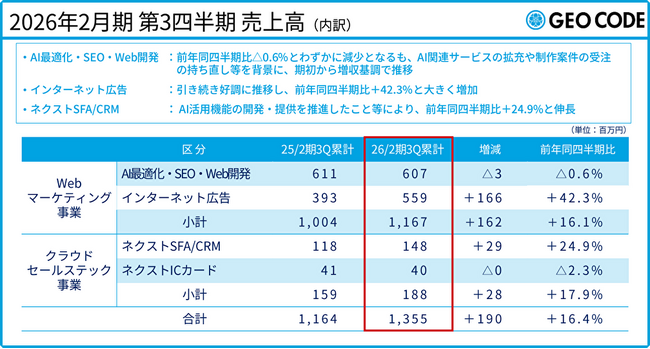 売上高は、AI最適化・SEO・Web開発がわずかに減収となるも、インターネット広告およびクラウドセールステック(ネクストSFA/CRM)が大きく伸長し、前年同四半期比+16.4%となりました。また、営業利益は、増収効果に加え、AI活用による業務プロセスの一部内製化を通じた費用抑制等が寄与し、前年同四半期の損失から62百万円改善し、30百万円の黒字に転換しました。