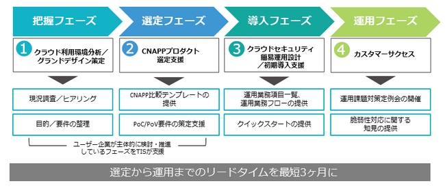 今回TISが提供する「CNAPP導入運用最適化支援サービス」は、CNAPPの導入を検討・推進している企業を対象に、TISの500件を超えるマルチクラウド環境構築や運用実績を通じて培った知見に基づき、最適な製品選定から運用内製化までを一貫して支援します。また、自社のクラウドセキュリティ対策の状況と課題を可視化する「把握フェーズ」および個社ごとの課題や要件に合った製品選定を行う「選定フェーズ」における支援メニューを整備することで、選定から運用まで通常6ヶ月~1年かかるリードタイムを最短3ヶ月に短縮します。