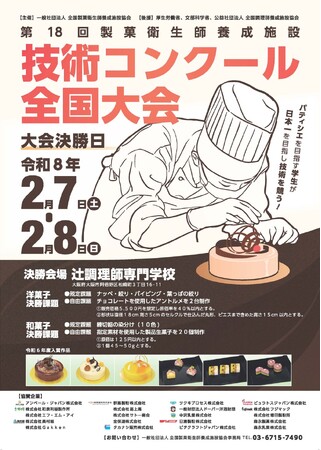 一般社団法人全国製菓衛生師養成施設協会が主催する「第18回製菓衛生師養成施設技術コンクール全国大会」が2026年2月7日(土)・8日(日)の2日間、辻調理師専門学校(大阪市)にて開催されます。