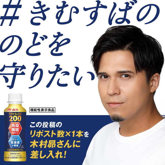 指定のキャンペーン投稿がリポストされるごとに、その数に応じた本数の「森永ラクトフェリン200ドリンクタイプ」が木村昴さんへ実際に差し入れされ、ファン一人ひとりの応援の気持ちが“見える形”で本人に届く仕組みとなっています。
