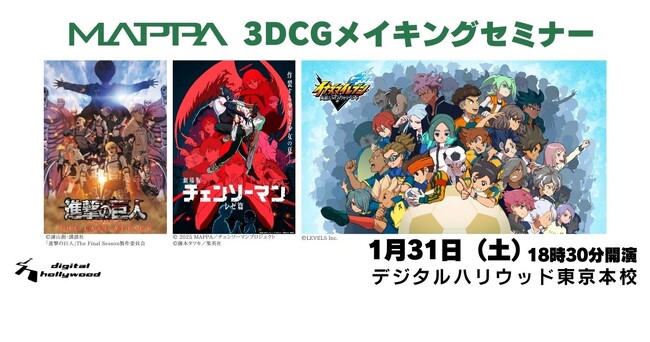 IT関連及びデジタルコンテンツの人材育成スクール[デジタルハリウッド] (運営会社:デジタルハリウッド株式会社、本社/本校:東京都千代田区、代表取締役社長兼CEO:藤井雅徳、学長:杉山知之)では、株式会社MAPPAの池田昴氏、金渡勲氏をゲストに迎え、3DCGメイキングセミナーを2026年1月31日(土)に開催いたします。