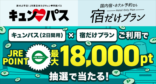 1.「キュン(ハート)パス(2日間用)」と、えきねっとの「宿だけプラン」を購入・宿泊利用された方の中から、抽選で350名様にJRE POINTを最大18,000ポイントプレゼント!