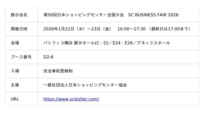 「SC BUSINESS FAIR 2026」 はショッピングセンター(SC)関係者が一堂に会し、全国のSCディベロッパーやテナント、DX・テクノロジー系企業による出展およびSC関係者による講演を提供する商談展示会です。