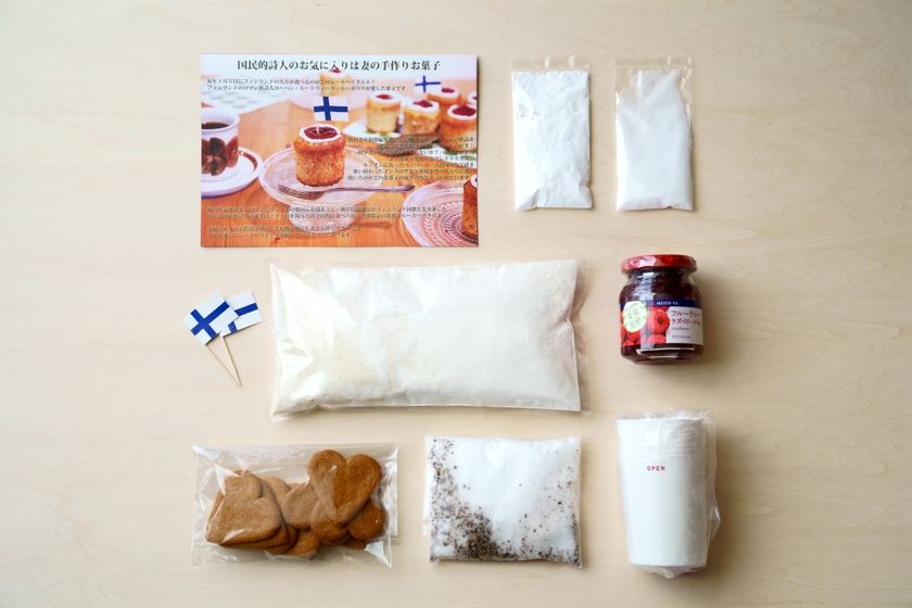 - キット内容:オリジナルレシピ、粉ミックス、ジンジャークッキー袋、カルダモンシュガー袋、シロップ用グラニュー糖袋、アイシング用粉糖袋、ベーキングカップ10枚、フィンランド国旗2つ。ラズベリージャム170g瓶付属(フランス産サンダルフォー)