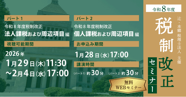 辻・本郷 税理士法人(本社:東京都新宿区、理事長:桑木小恵子)は、2026年1月29日(木)より「令和8年度 税制改正セミナー」を開催いたします。本セミナーでは、12月19日(金)に自由民主党・日本維新の会から公表された「令和8年度税制改正大綱」より、主な改正・見直し項目をまとめ、注目点をわかりやすくお伝えする無料Webセミナーです。法人向けは法人税・地方税・消費税など法人に関係する部分を中心に、個人向けは相続税・贈与税・所得税など個人に関係する部分を中心に税理士が徹底解説いたします。