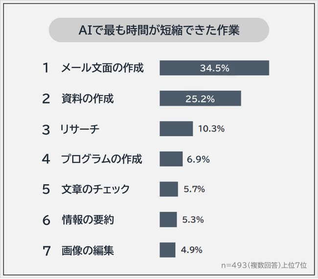 お仕事をしている493人に「AIで最も時間が短縮できた作業」を聞いたところ、1位は「メール文面の作成(34.5%)」でした。2位「資料の作成(25.2%)」、3位「リサーチ(10.3%)」が続きます。