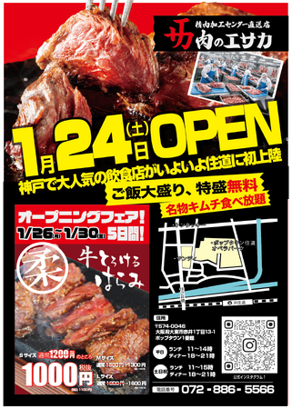 食肉加工工場の運営会社が仕掛ける「肉のエサカ 住道店」1月24(土)に大阪府大東市でグランドオープン!!目玉商品は、超やわらかい「熟成とろけるハラミ」。神戸で大人気業態が住道の駅近に初上陸!!