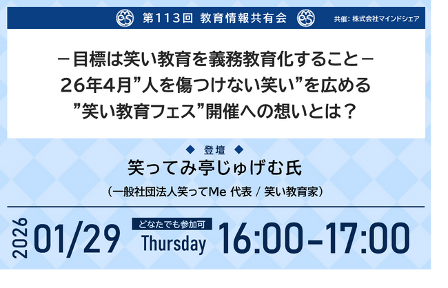 笑いを通じて人を尊重する力を育む「笑い教育」の取り組みを紹介【第113回教育情報共有会|1月29日|どなたでも参加可|視聴無料】
