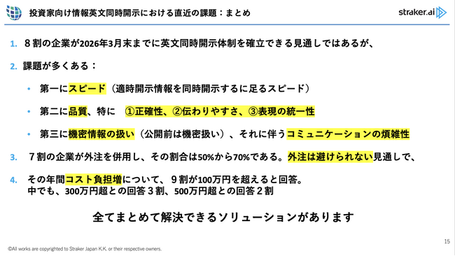 また、2025年11月にStraker JapanがIR担当者に行った独自の定量調査では、8割の企業が2026年3月末までに英文同時開示体制を確立できる見通しではあるものの、各企業で多くの課題があることが分かりました。課題として、最も多かったのが「スピード(適時開示情報を同時開示するに足るスピード)」です。次に「品質」、特に1.正確性、2.伝わりやすさ、3.表現の統一性に課題が多く残ることが分かりました。