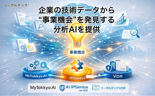 リーガルテック株式会社(東京都港区:代表取締役社長 平井 智之)は、企業が保有する技術データや特許情報を統合し、新規事業機会や技術応用領域をAIが提示する「事業機会探索AI」を提供開始した。本取り組みは、特許・技術分析基盤「MyTokkyo.Ai」を軸に、発明創出基盤「IPGenius」、技術文書共有基盤「リーガルテックVDR」と連携し、技術資産からの新規事業創出を支援するものである。技術起点の事業開発を高度化し、企業の成長機会拡大を目指す。
