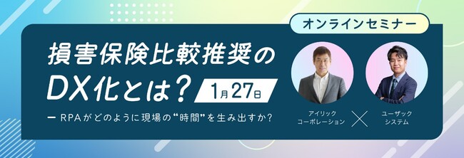保険業界に精通したDXソリューションを展開する株式会社アイリックコーポレーション(本社:東京都文京区、代表取締役社長CEO 勝本 竜二、以下 アイリックコーポレーション)と、業務プロセスの自動化・効率化を支援するユーザックシステム株式会社(本社:大阪府大阪市、代表取締役社長:小ノ島 尚博、以下 ユーザックシステム)は、保険業法改正への対応と損害保険比較推奨業務のDX推進をテーマとしたオンラインセミナー「業法改正にスピード対応!損害保険比較推奨のDX化とは?」を、2026年1月27日(火)に共同開催します。