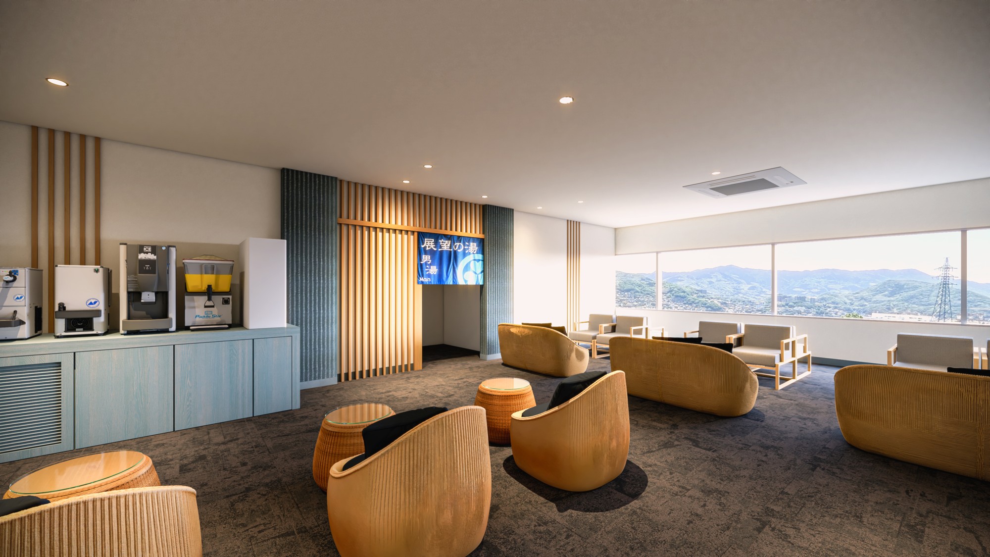 お風呂上りには新設する湯上りラウンジがおすすめです。ドリンクカウンターを設置し、コーヒーやソフトドリンクはもちろん、ビールなどのアルコール類も無料でご提供いたします。
