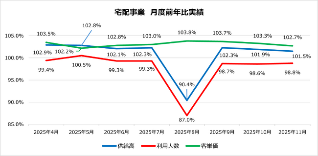 2025年4月度~11月度の宅配事業は、利用人数が前年を下回る中、値上げによる単価の上昇により客単価が増加し、供給高全体としては前年を上回っています(受注高:前年比100.5%、利用単価:前年比103.1%、利用人数:前年比97.7%、利用点数:前年比96.9%)。一方で、加入経路の主力であった戸別訪問の減少や、夏季一斉休業以降の利用人数の低下(98%台)など、利用人数の確保が課題となっています。