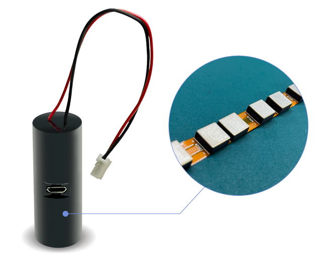 本モジュールは、現在ER電池を使用しているユーザーも容易に導入できるよう汎用的なER電池サイズ互換(直径17.9mm、高さ50mm)の筐体に、量産品の全固体電池「PSB401010H」を8個搭載することで35mAhの容量を確保するとともに、電池電圧を3.6Vに変換し、出力する回路を内蔵しています。充電に関しては、5V充電に対応しています。