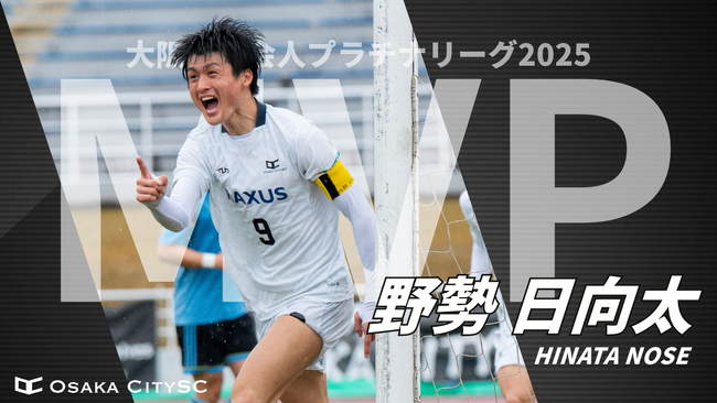 2025年度の「大阪府社会人プラチナリーグタイトル」が発表され、Osaka City SCの野勢日向太選手がMVPならびに得点王を受賞したことをお知らせいたします。