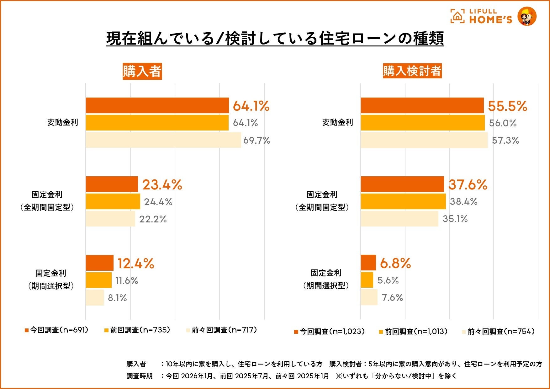購入者には現在組んでいる住宅ローンの種類、購入検討者には検討している住宅ローンの種類について聞いたところ、共に「変動金利」が最多となりました。その割合は購入者が64.1%(25年7月調査(以下「前回調査」):64.1%)と変化がなかった一方で、購入検討者が55.5%(前回調査:56.0%)と前回より選択割合が低くなりました。固定金利では購入者、購入検討ともに「全期間固定型」は微減し「期間選択型」が微増しています。購入者においては「期間選択型」が25年1月調査(以下「前々回調査」)から4pt増えています。金利上昇への懸念は依然として強く、「変動金利」一択ではなく「期間選択型」を選択、検討する状況がうかがえます。[画像2: https://prcdn.freetls.fastly.net/release_image/33058/798/33058-798-304689fbbba06202e8b41b7ecfea84ea-1754x1240.jpg?width=536&quality=85%2C75&format=jpeg&auto=webp&fit=bounds&bg-color=fff ]